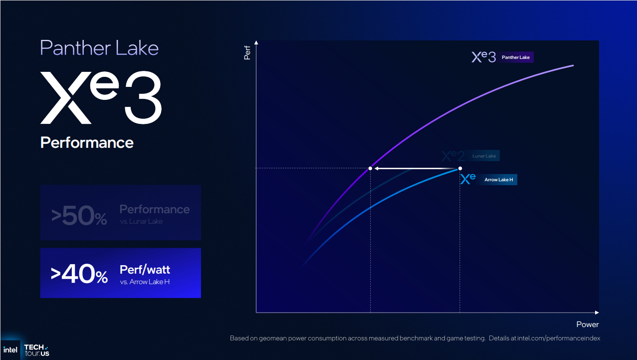 If you directly compare Panther Lake to Lunar Lake for efficiency, Xe3 still delivers a performance-per-watt improvement, but it's smaller (probably under 20%, if we had to eyeball it). Gripes about relevant comparisons aside, what we should take away here is that the Lunar Lake iGPU (at least in its 12 Xe Core form) delivers both performance per watt improvements and a broader range of performance scaling possibilities compared to the company's past integrated GPU efforts.
