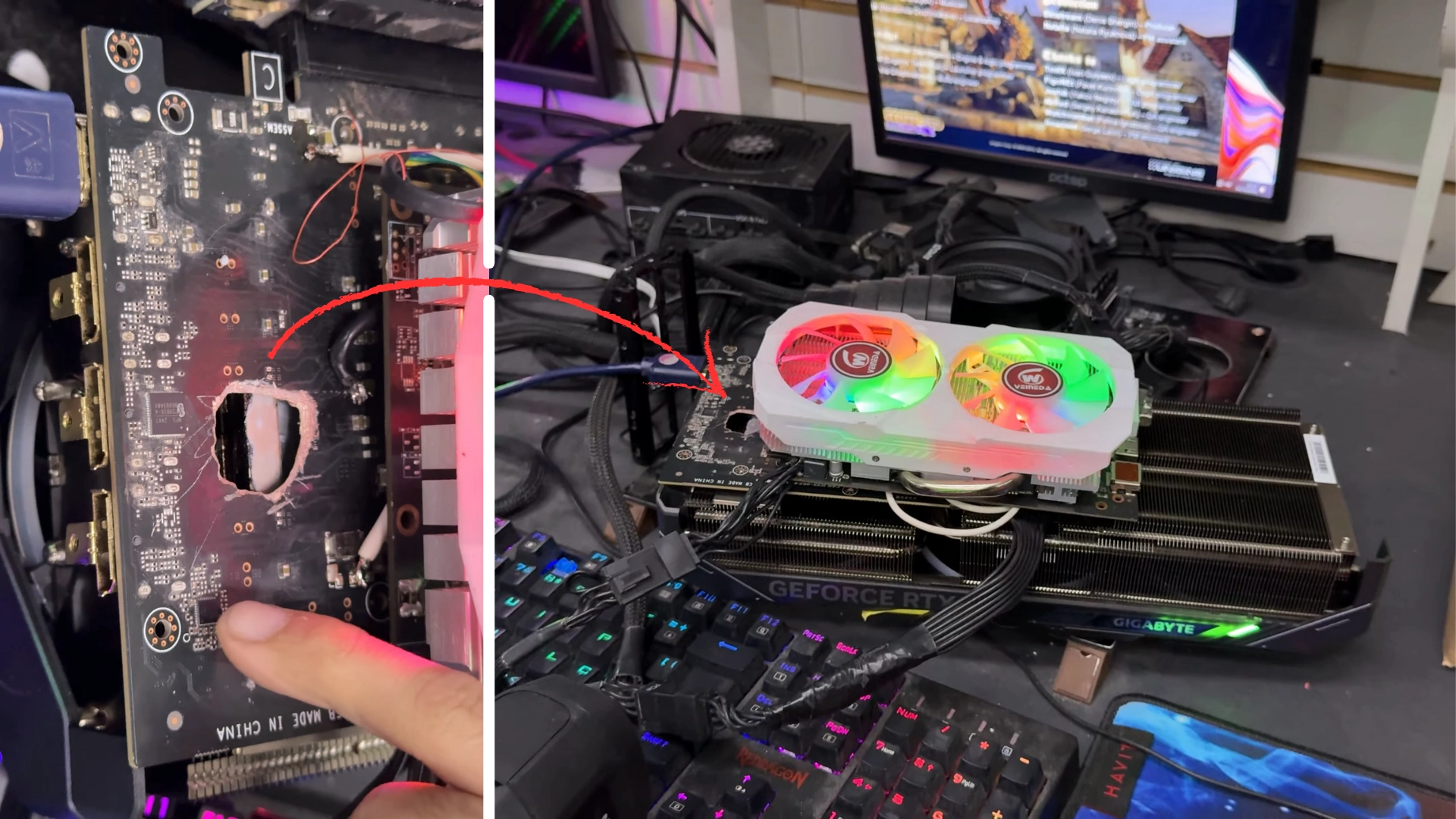 RTX 5070 Ti with catastrophic damage brought back to life by RX 580 — AMD VRM graft resurrects card with a huge hole burned into its PCB