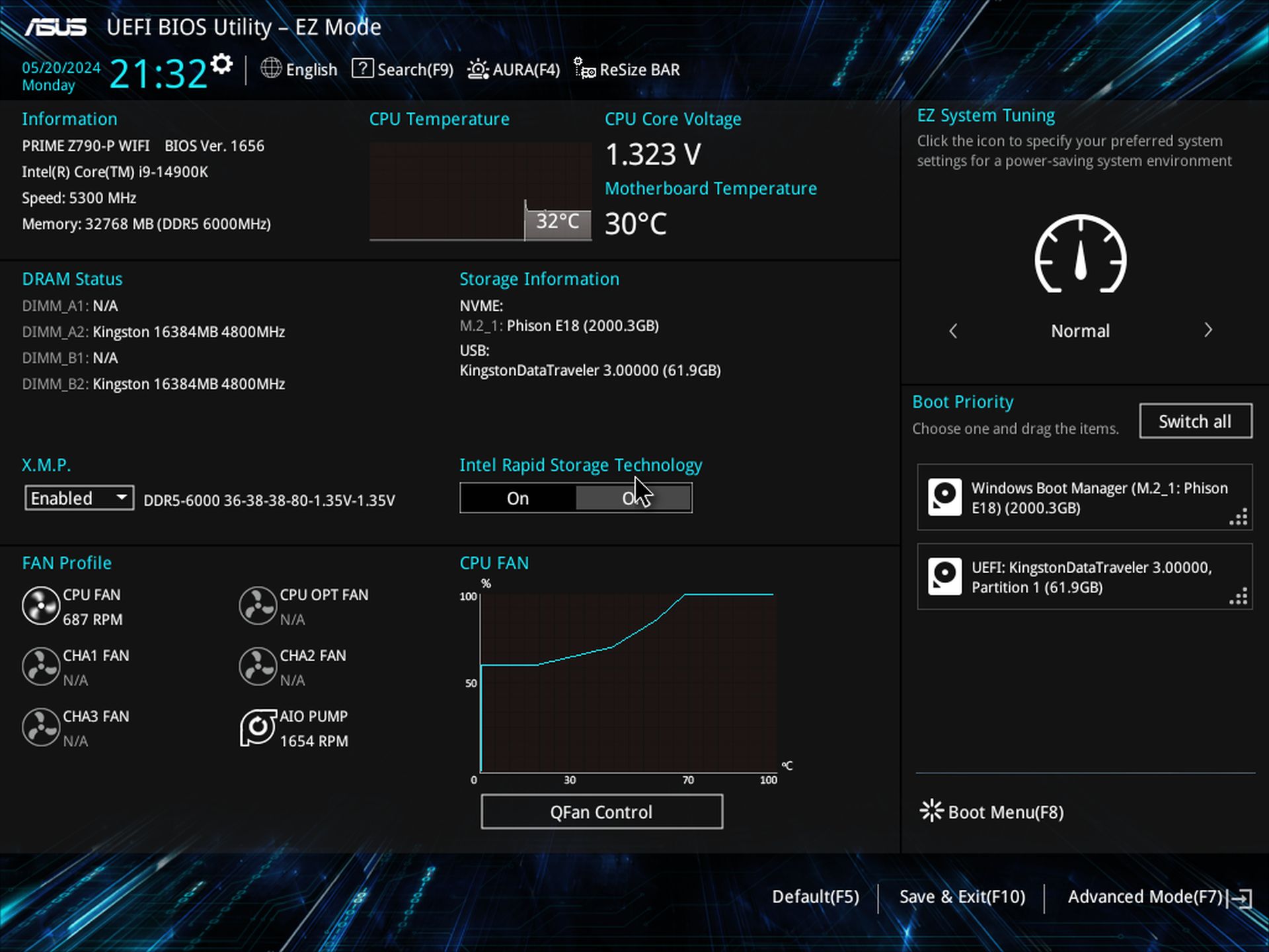 Like the other ASRock boards, the B760M Pro RS starts in Easy Mode, which is primarily informative, but it lets you change a few options (XMP, profiles, boot order, Fan-Tastic Tuning, etc.). The black background and light blue accent colors match the Pro RS theme and are easy to read. Advanced mode displays headings across the top, with details below.