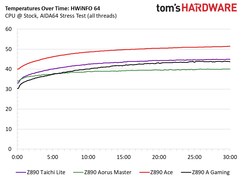 We used AIDA64’s System Stability Test with Stress CPU, FPU, Cach, and Memory enabled for power testing, using the peak power consumption value from the processor. The wattage reading is from the wall via a Kill-A-Watt meter to capture the entire PC (minus the monitor). The only variable that changes is the motherboard; all other parts remain the same. Please note we moved to use only the stock power use/VRM temperature charts, as this section aims to ensure the power delivery can handle flagship-class processors.