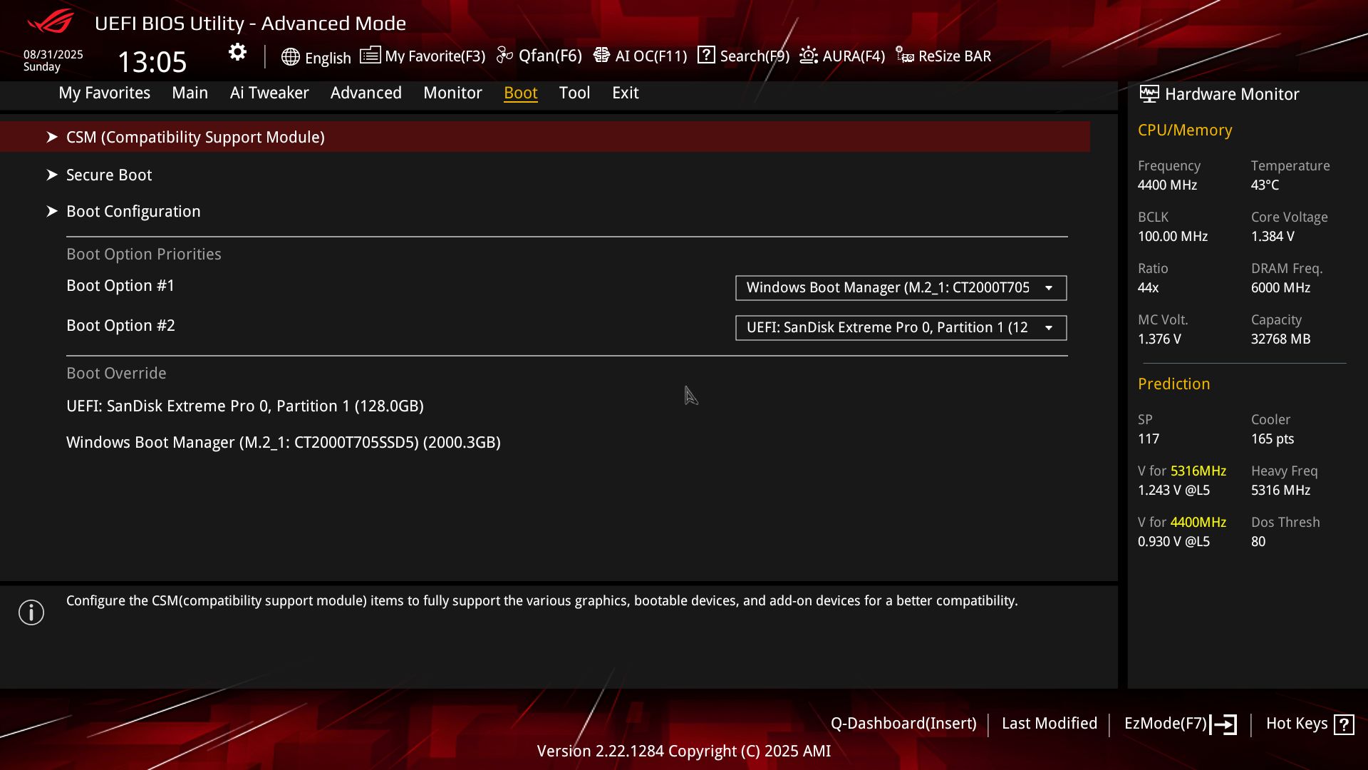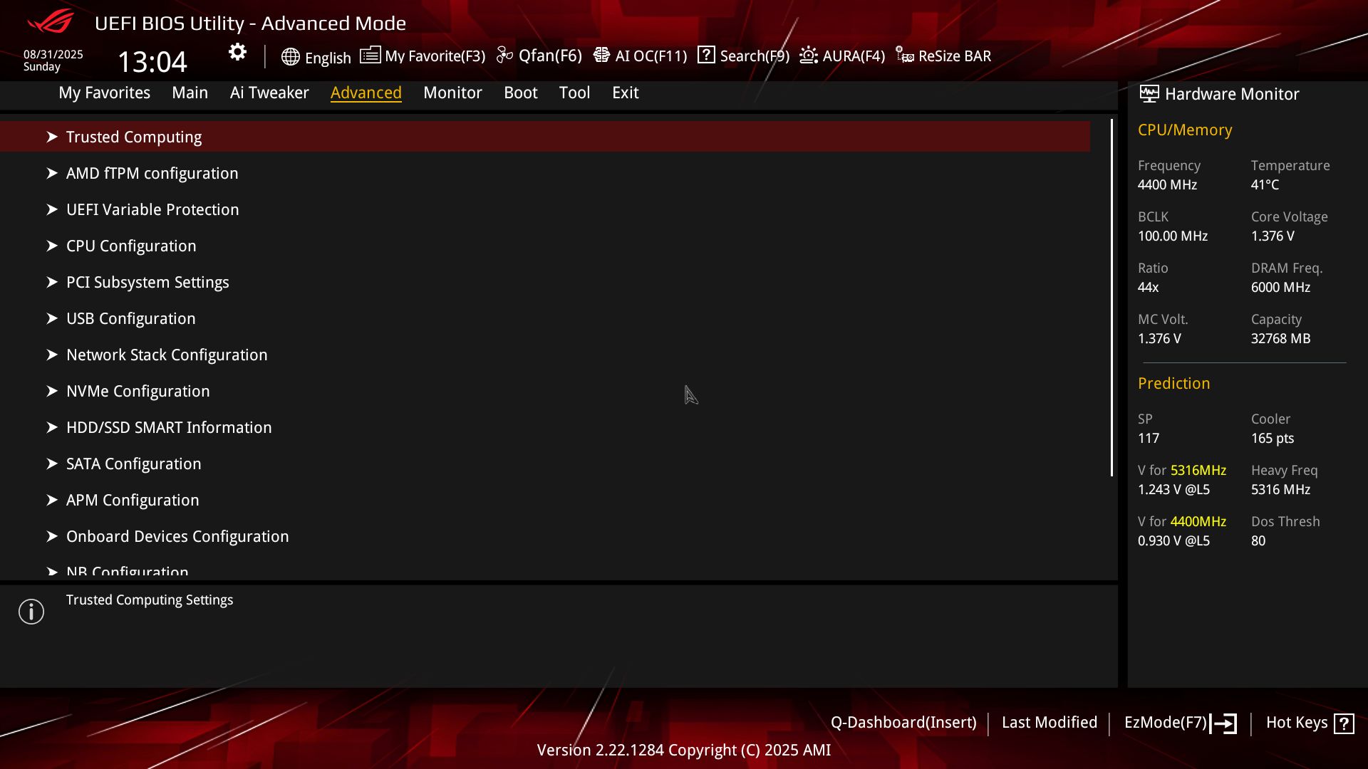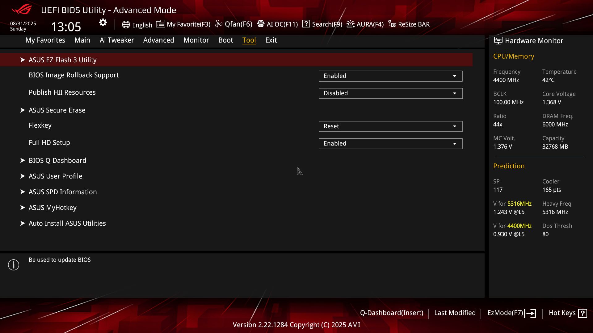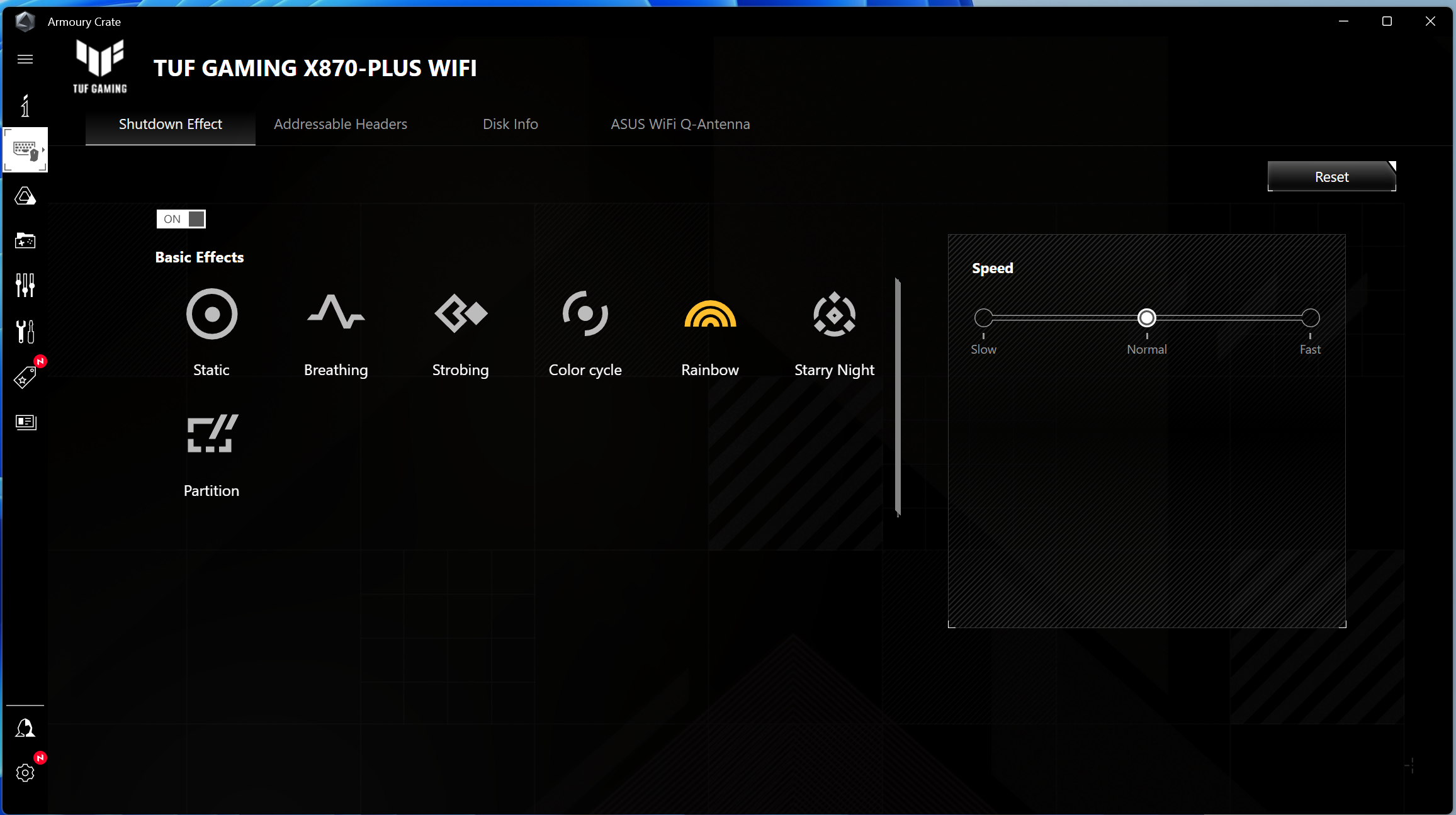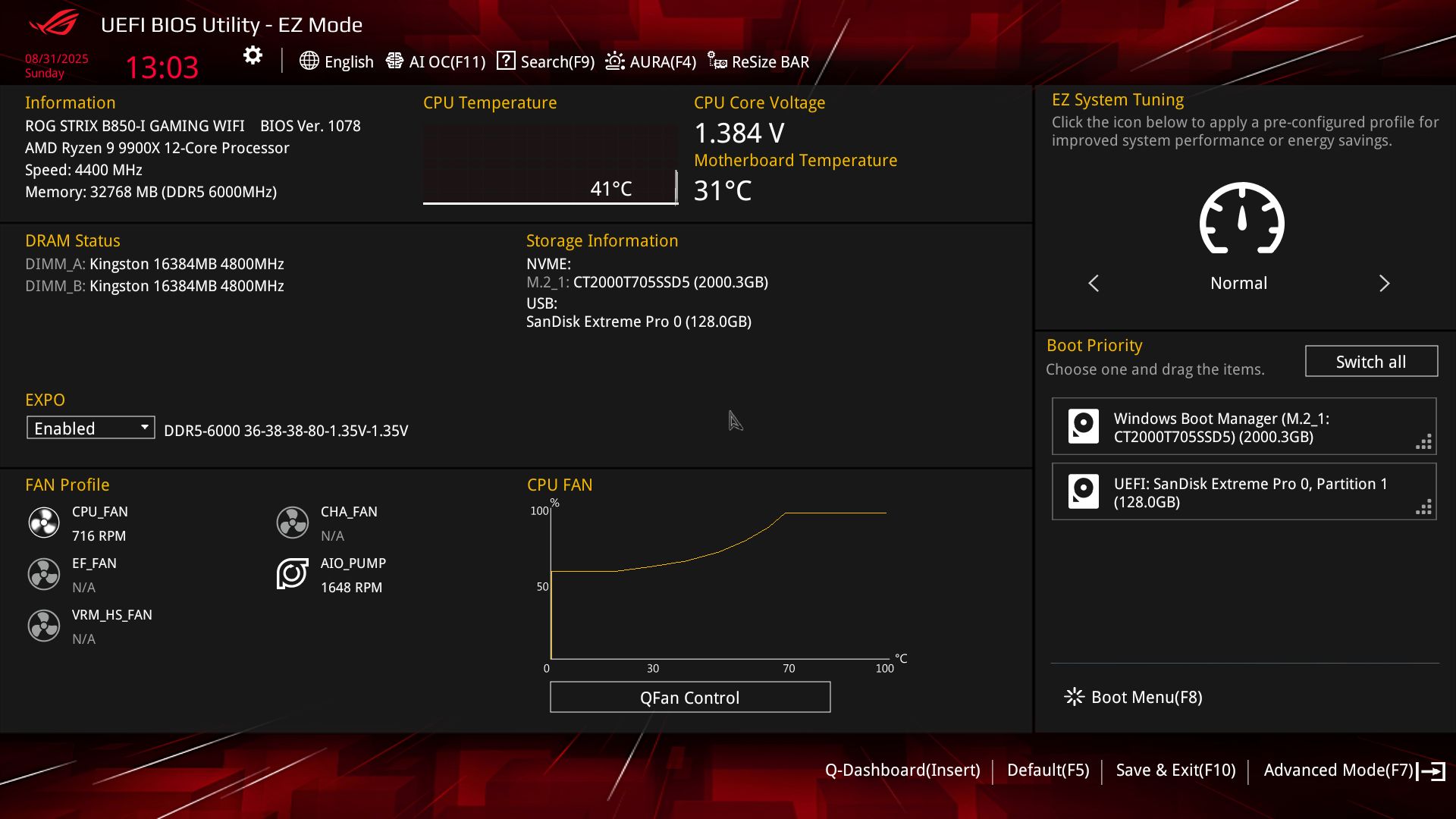 Asus’ BIOS on the B850-I Gaming looks like any other ROG board, sporting the black, red, easy-to-read ROG theme we’re all familiar with. Asus starts in an Easy Mode that displays high-level information, including CPU and memory clock speeds, temperatures, fan speeds, storage information, etc. Advanced Mode has several headers across the top that drop down additional options. The new Q-Dashboard shows all the integrated connectivity. When hardware is connected, there’s a green circle next to it. The BIOS is one of my favorites, as any option you need is there, and anything you need frequently isn’t buried deep within menus.