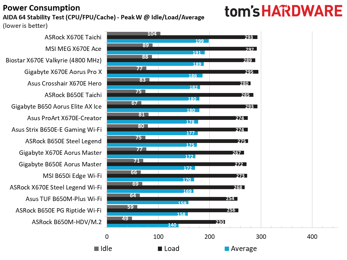 We used AIDA64’s System Stability Test with Stress CPU, FPU, Cache, and Memory enabled for power testing, using the peak power consumption value. The wattage reading is from the wall via a Kill-A-Watt meter to capture the entire PC (minus the monitor). The only variable that changes is the motherboard; all other parts remain the same. Please note we moved to using only the stock power use/VRM temperature charts. Since the system uses every available degree Celsius, unless you’re using a sub-ambient cooling solution, you’ll use more power and generate more heat using default settings.