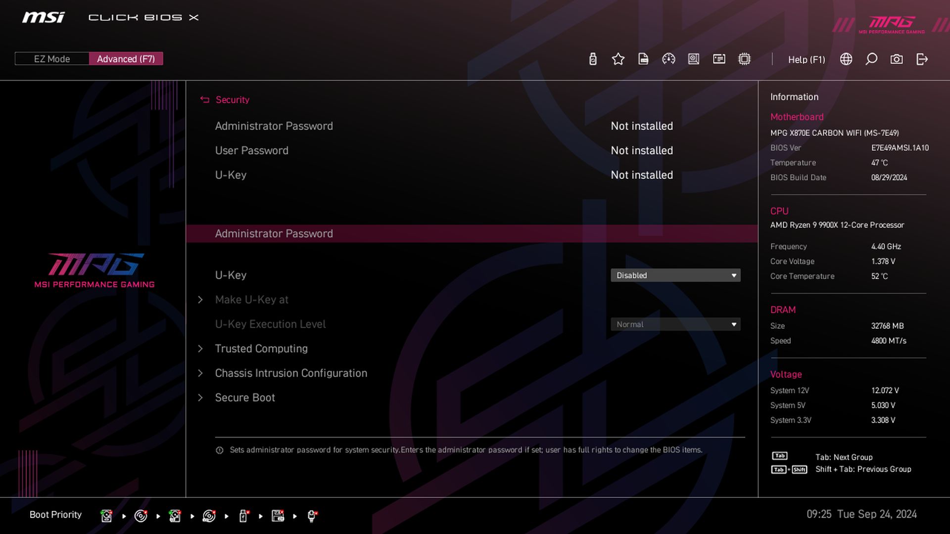 With X870, MSI has updated its BIOS, renaming it “Click X”, and improved the aesthetic and functionality. The company changed up the format with the headings on the left side, details in the middle, and system status information on the right side. Like most other board partners, it has an informational EZ Mode that allows for limited functionality, such as Game Boost, PBO, and more. Overall, I like the new layout, and maneuvering around is intuitive after a short time, though it does take some getting used to. The dark, fading purple background and white labeling are easy to read, and most of what you need is at your fingertips.