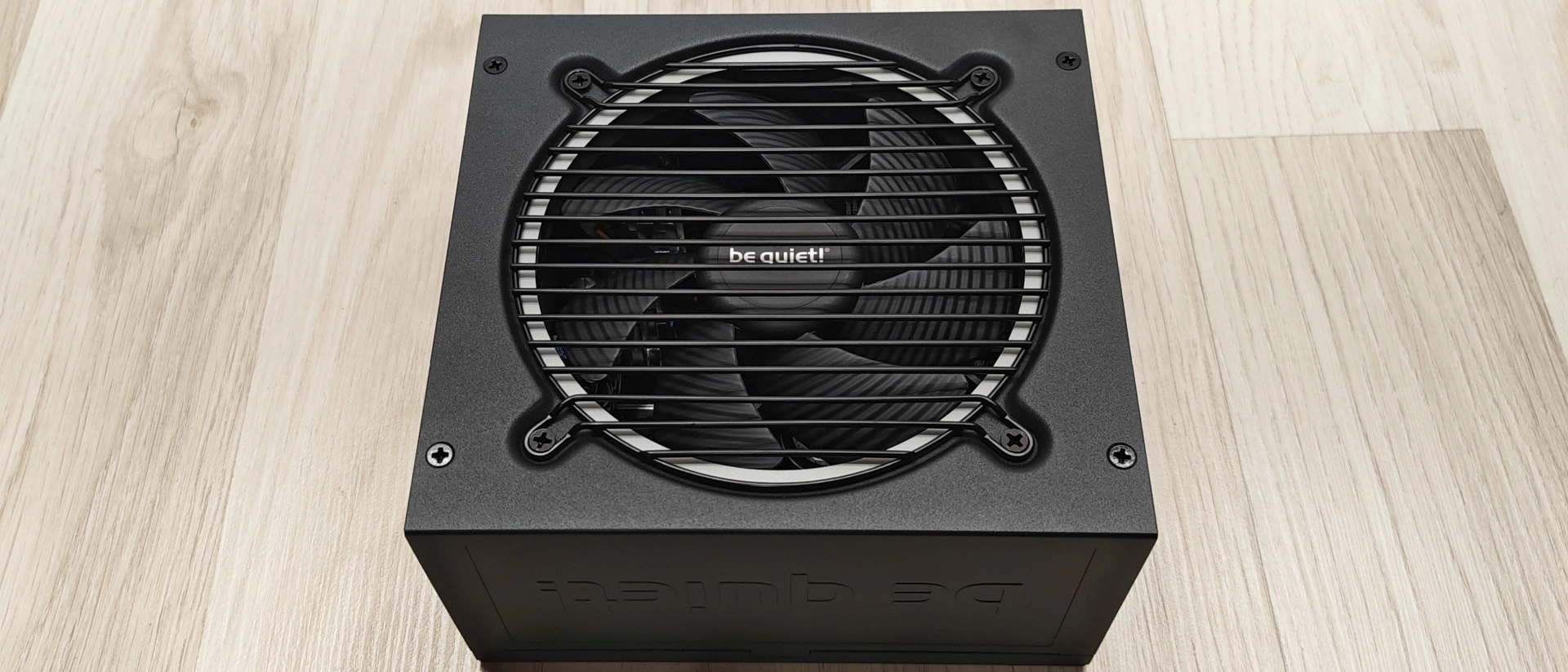 The external finish employs satin black chassis paint, applied with precision. Be Quiet!'s embossed logo appears on the right side panel, providing subtle branding without visual clutter. A removable parallel wire fan guard sits above the intake, with a white decorative ring beneath creating modest visual interest. The left side contains the standard electrical specifications sticker. The top panel remains completely unadorned.