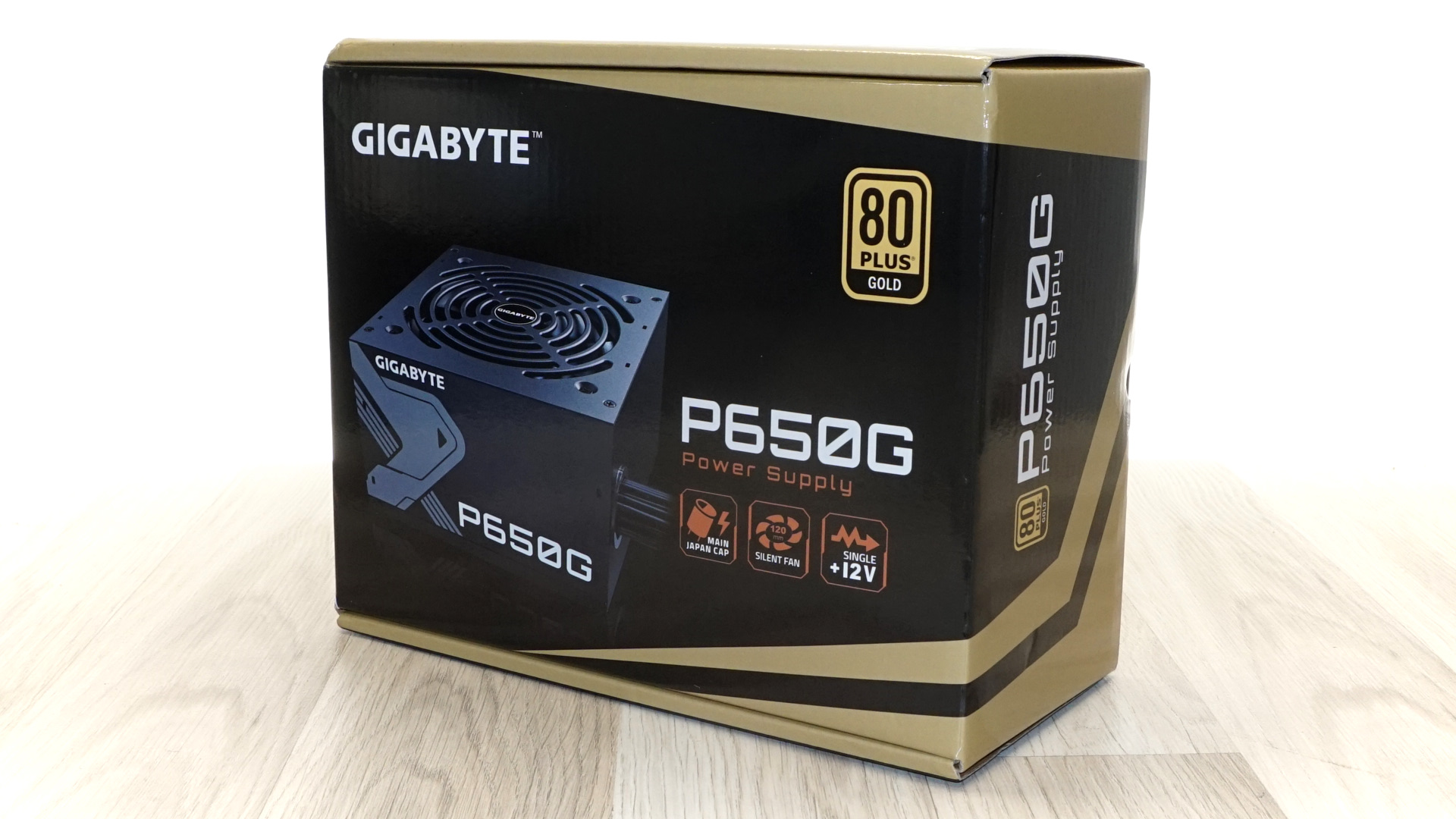 The Gigabyte P650G arrives in utilitarian packaging that prioritizes protection over marketing flash. The cardboard box features a black and gold aesthetic theme that reflects the unit's positioning, with the front panel showcasing a picture of the power supply itself. Inside, foam inserts and a protective nylon pouch provide adequate protection during transport.