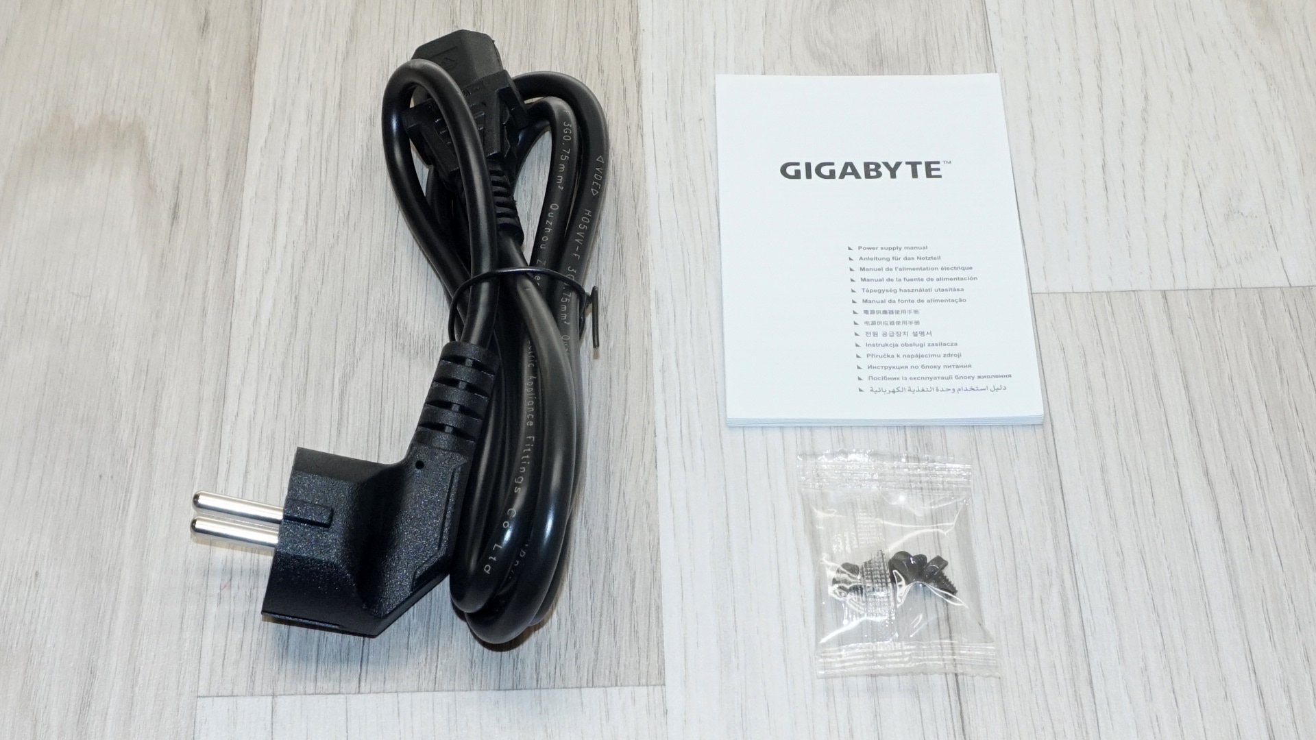 The included accessories take a minimalist approach, containing only the essential mounting screws and standard AC power cable. Gigabyte has not included any cable management accessories, documentation beyond basic specifications, or premium touches that might elevate the unboxing experience. This streamlined approach makes sense for a value-oriented product, though it does underscore the unit's positioning in the market hierarchy.