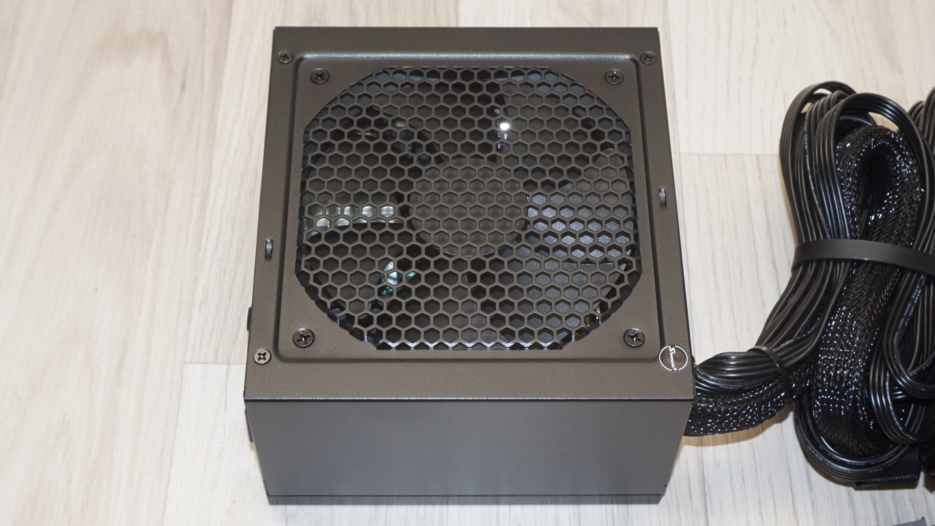The top surface features a honeycomb-pattern fan finger guard that integrates seamlessly with the chassis. It is very dense and there is no logo standing out. This design provides effective airflow characteristics while maintaining the unit's clean, professional appearance. The overall presentation strikes a balance between functionality and understated elegance that should complement virtually any build without drawing attention to itself.