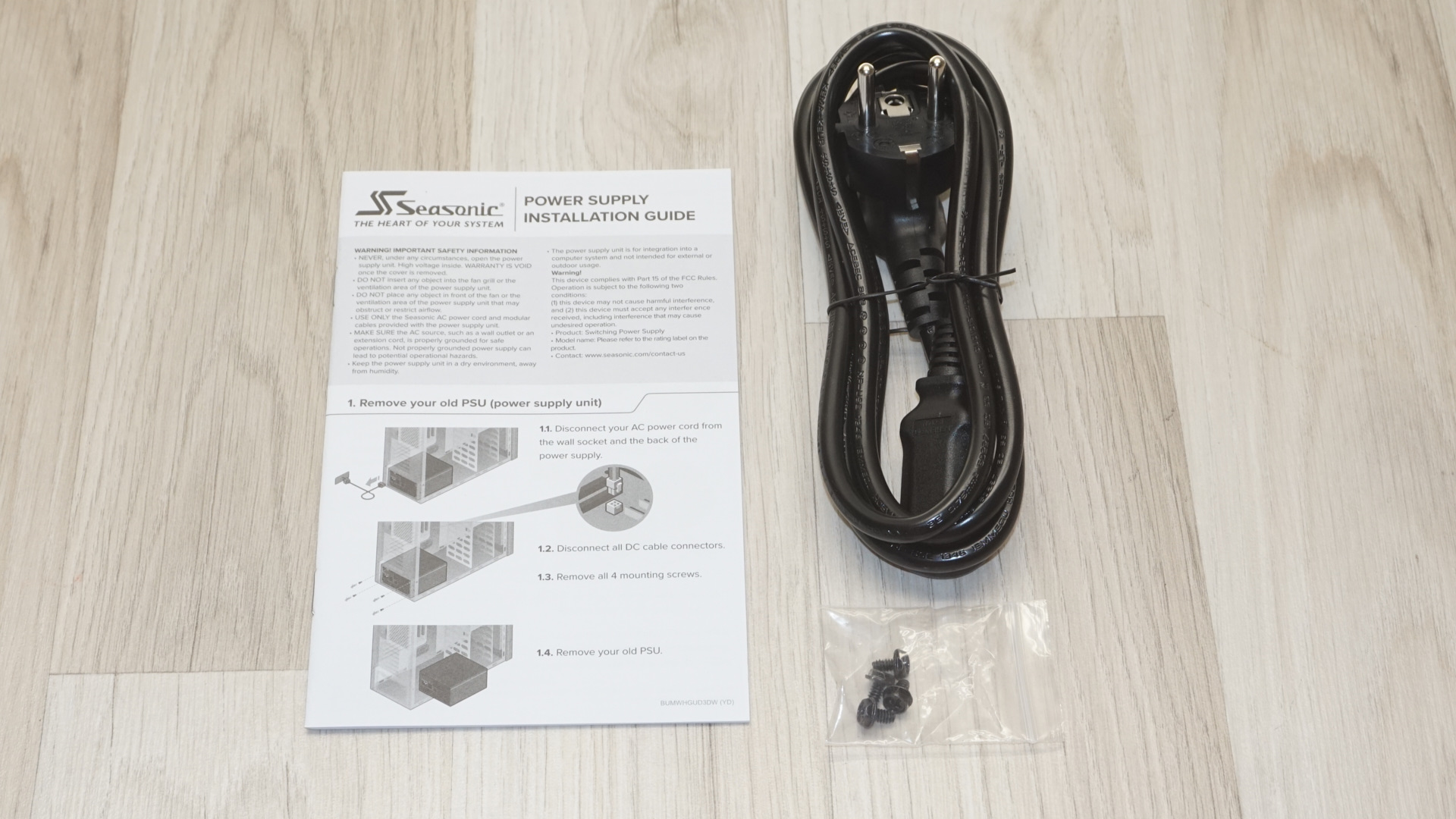 The accessory bundle strips away any pretense of premium treatment. Seasonic includes only the bare essentials: mounting screws and a standard AC power cable. There are no cable management accessories, no documentation beyond basic specifications, and none of the extras that we would expect bundled with a premium unit.