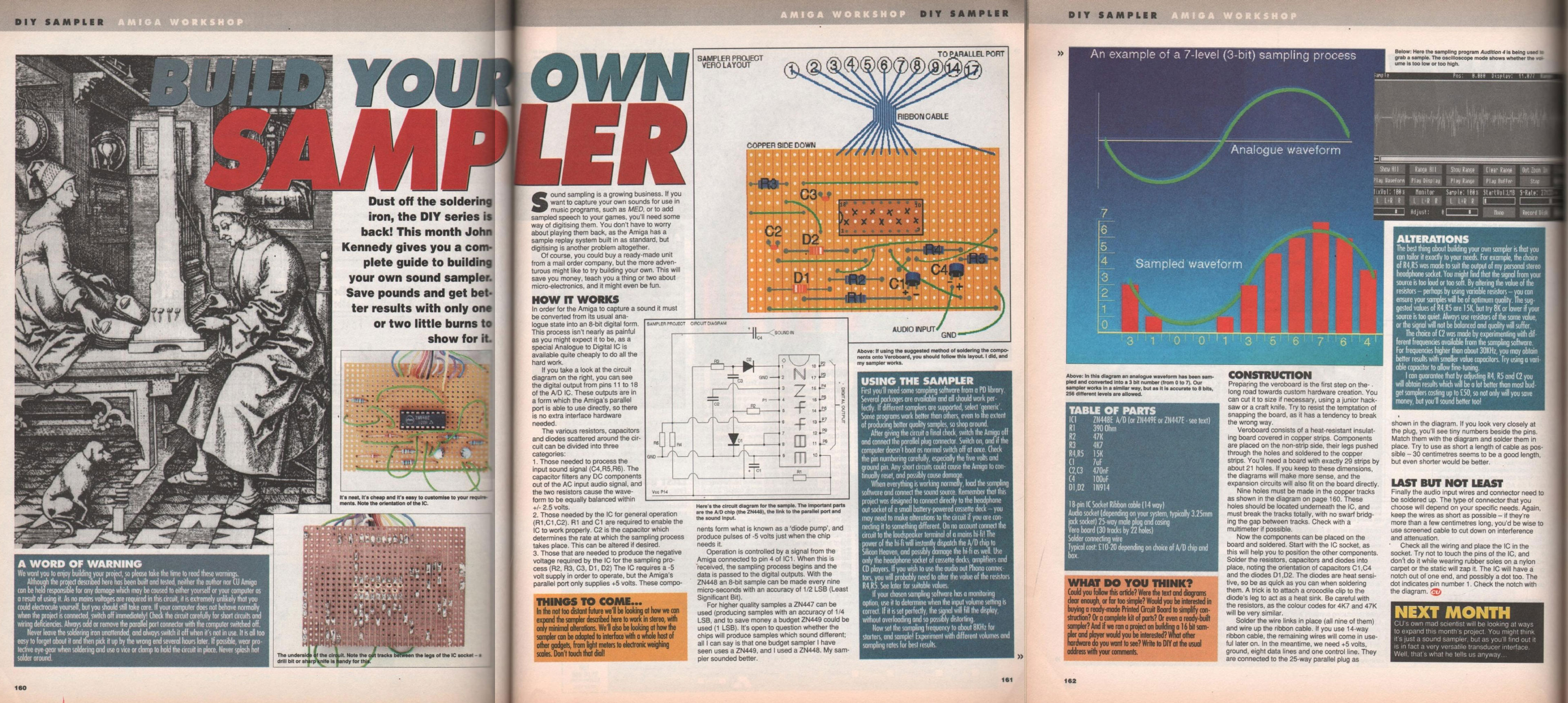 Smith explains that he was saving up for a pre-built sound-sampler expansion when he spotted the above-linked CU Amiga issue and the step-by-step guide to making your own ‘generic’ model. Typically, Amigans would use these to grab audio samples for developing games, demos, slideshows, and ProTracker (.MOD) compositions. The project appeals as it fused his computer and DIY electronics interests.