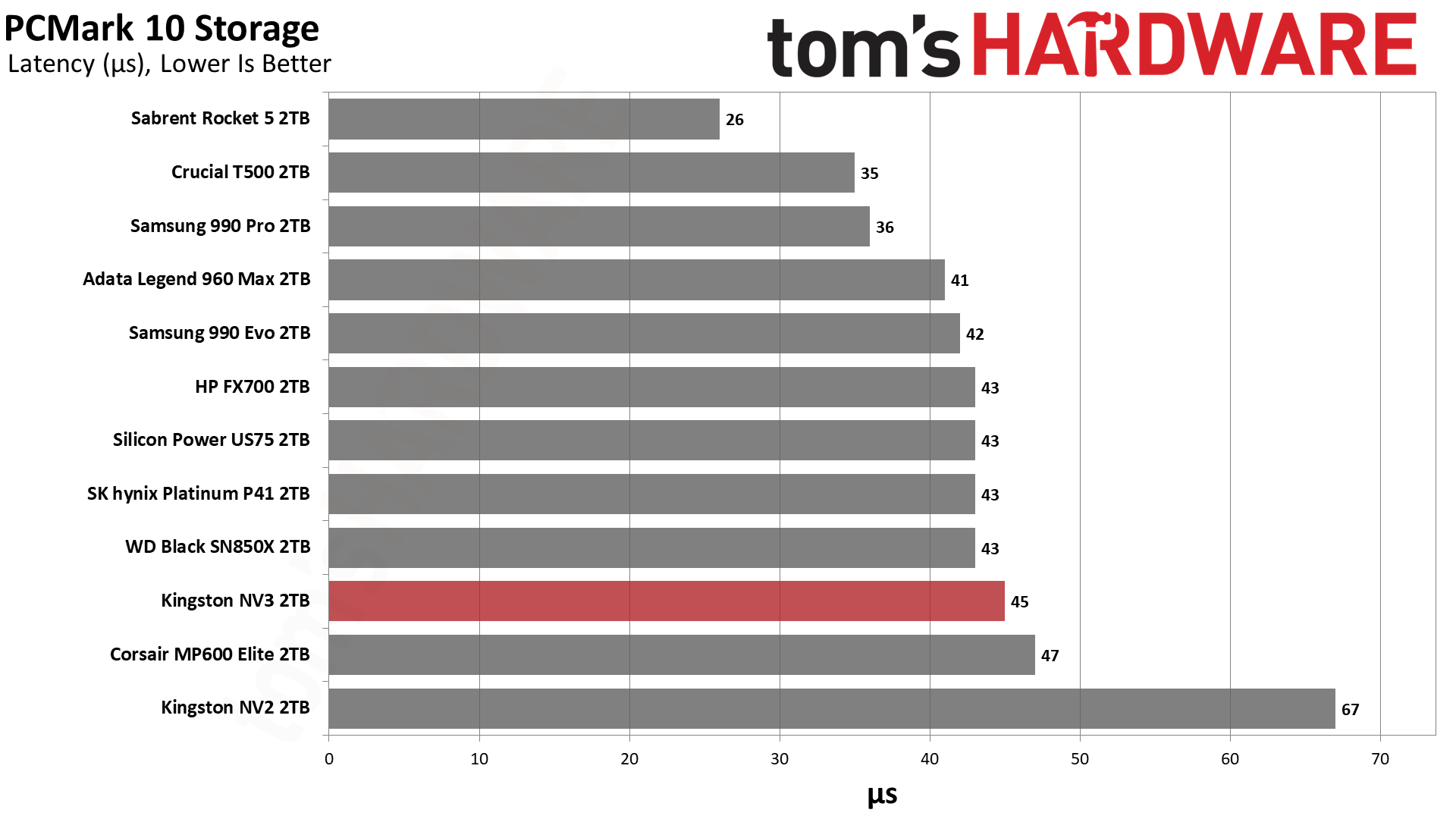 The Kingston NV2 is a natural drive choice for comparison, showing how far budget SSD hardware has come. Other budget drives in the NV3’s range include the Corsair MP600 Elite, the Silicon Power US75, and the QLC-based HP FX700. The Crucial T500 is also technically a budget drive, although more typically it's priced along with the best PCIe 4.0 SSDs: the Samsung 990 Pro, the WD Black SN850X, and the SK hynix Platinum P41. SMI controllers are harder to find in this space, but we do have the Adata Legend 960 Max. Lastly, to round it out with a PCIe 5.0 SSD, we have the Sabrent Rocket 5 on deck to illustrate what maximum SSD performance (and a much higher price) will get you.
