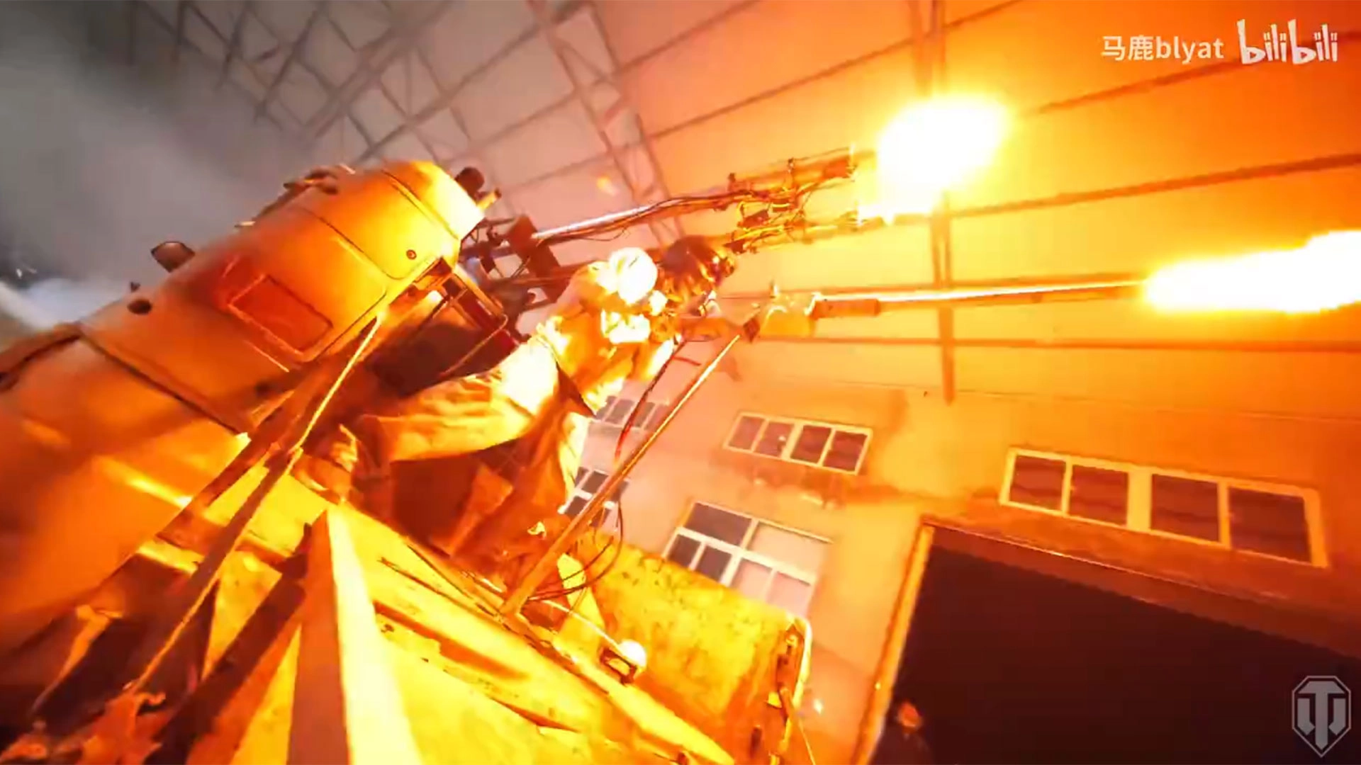 The frantic video begins with Bylat driving what might be dubbed a ‘Tactical vehicle’ out of a garage, cannon blazing. It switches to the corresponding on-screen WoT action, where the anti-armor cannon can be seen peppering an enemy tank until it violently explodes.