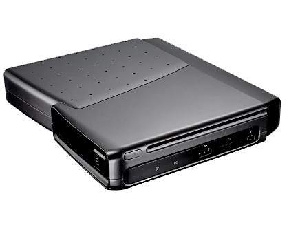 The HTPC out of its stand. The right side has a power switch and air vent. When in the stand, the right side becomes the top of the unit. The front includes a CD/DVD slot and several other items, which we'll cover in a bit.