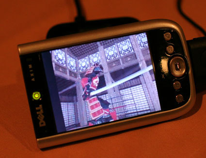 Mobile devices can now easily render full-motion game video. Futuremark showed off this Dell Axim running a mobile version of 3dMark.