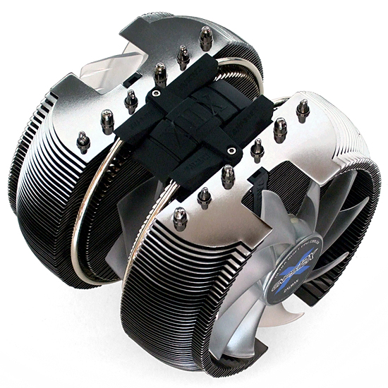 The EFZ-120HA5 includes enough rubber mounting studs for dual-fan push-pull configurations, but comes with only a single low-speed 120 mm blower. Three heat pipes are arranged in a V-shape to direct more of the air down the heat sink’s center, and SilenX even folds the fins to keep air from blowing out the sides.