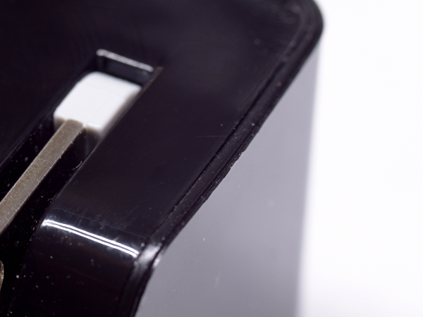 Upon removing the plastic film, I noticed hairline cracks radiating from the tiny LED hole. I’ll hazard a guess that fast, uneven cooling of the thin plastic shell caused these. The area still feels solid, which means these are only surface cracks. For now.