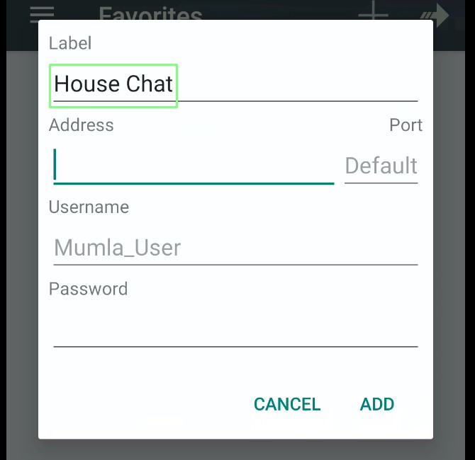 4. Set the address to the IP address of the Raspberry Pi Mumble Server. Then create a username and enter the server password that you set in Step 9 of the install and config section of this how to. Click Add.