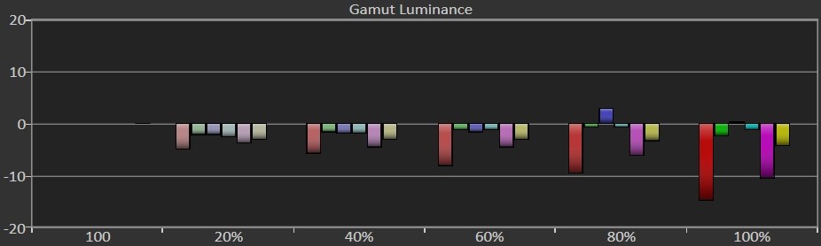 Finally, the most important metric is overall color accuracy, which is also measured in DeltaE 2000. As such, a color-accurate display should aim for a DeltaE 2000 below 3. Sure enough, the Gigabyte's display exhibits the lowest DeltaE value in our roundup, at 1.792. In other words, you shouldn't see any imperfections in color accuracy. The only noteworthy errors are reds and greens at maximum brightness, and even then, they are barely noticeable.