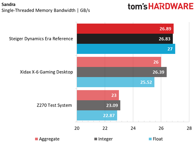 The Steiger Dynamics Era Reference once again predictably tops the chart with its higher memory frequency (3000 MHz), which provides a higher peak memory bandwidth over our test rig’s DDR4-2133 and the X-6’s DDR4-2666.