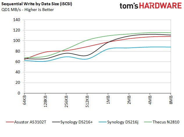 The sequential write test highlights the separation between the Intel and Marvell processor systems when writing data. The Synology DS216j offers amazing value, but you shouldn't expect it to provide the same performance as the Intel-based systems.