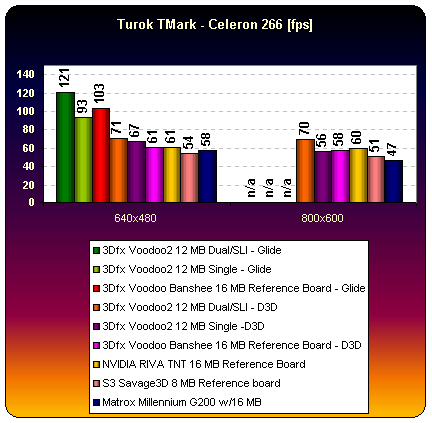 Banshee is looking pretty good at Turok, regardless if running Direct3D or Glide. Savage3D doesn't score that well in Turok as long as the `AA" setting is enabled, but I decided that a registry setting is either enabled for all test runs or for none, and Savage3D runs the mon2.dm2 demo in slow motion without `AA' enabled. TNT scores very well in Turok and comes pretty close after Voodoo2 SLI, as long as you are using a powerful Pentium II and not a cacheless Celeron or even less.