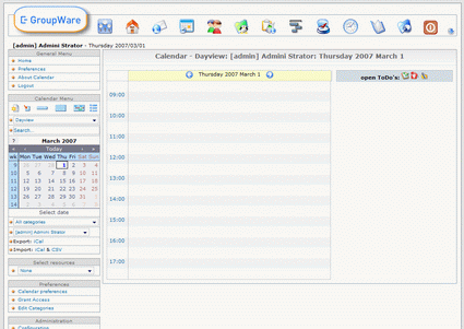 You might look for single entries of initialized or administered tasks and notes in the menu. They are summarized and set up as "InfoLog," and can be searched and edited as such. Tasks not yet accomplished will appear not only in the InfoLog, but next to the calendar's daily view as well. You are also able to import and export your calendar's data in the so-called iCal format. In addition to iCal files, the import function also supports CSV files.