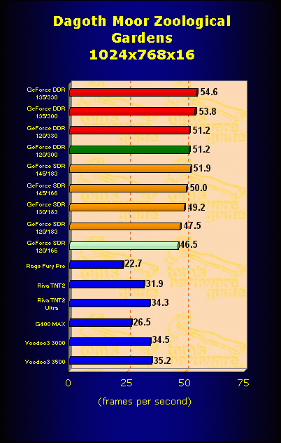 Explaining these results is not too easy. GeForce w/DDR is clearly faster than its brother equipped with SDR, but increasing GeForce's core clock is improving the frame rate scores as well. All that we can say is that the scores in this benchmark seem to be influenced by memory bandwidth, by the speed of the rendering pipeline and possibly by T&L-speed as well, all at the same time.