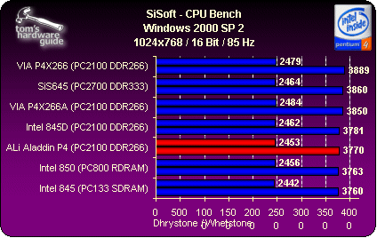 The SiSoft Sandra Benchmark 2001 shows that the ALi Aladdin P4 is shaky in the area of RAM performance. However, all these results should be taken with a grain of salt. This benchmark suite is only suitable for overclockers who are interested in checking a relative improvement in performance for a particular CPU.