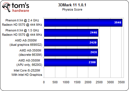 This is a fundamental win for Llano, assuming it holds up in real-world game benchmarks. Also note that the discrete 6630M shows a slight advantage over the APU. However, Dual Graphics mode doubles that spread. What the charts can’t convey is that we experienced unexpected skipping and visual anomalies using Dual Graphics mode in 3DMark. It looks like AMD has some driver work to do.