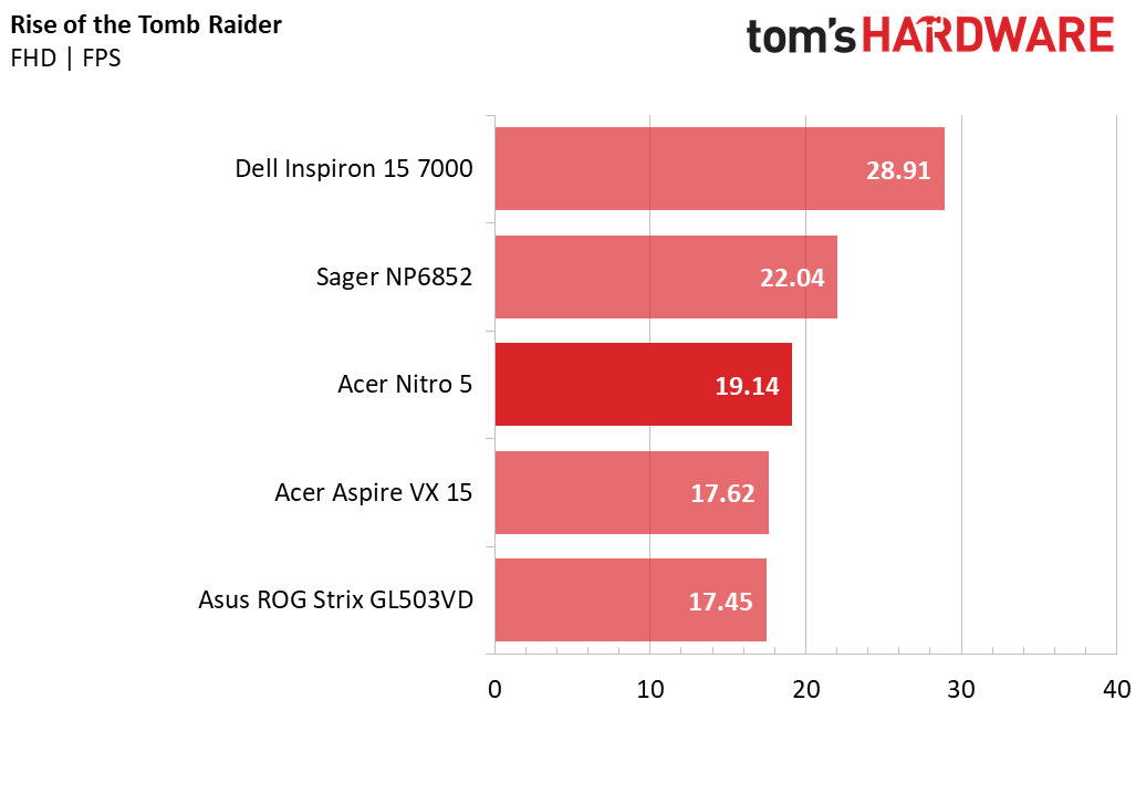 Rise of the Tomb Raider is one of our favorite benchmarks because it can bring even high-end systems to their knees at maximum settings. Tomb Raider features a GPU-bound workload, so your CPU won’t make a major impact on your performance. While this is great news for an i5-based laptop like the Nitro 5, its utter lack of GPU horsepower nets it an unplayable frame rate. The Inspiron performs about 51% faster thanks to the Max-Q GTX 1060, but still cannot breach the 30 FPS threshold.