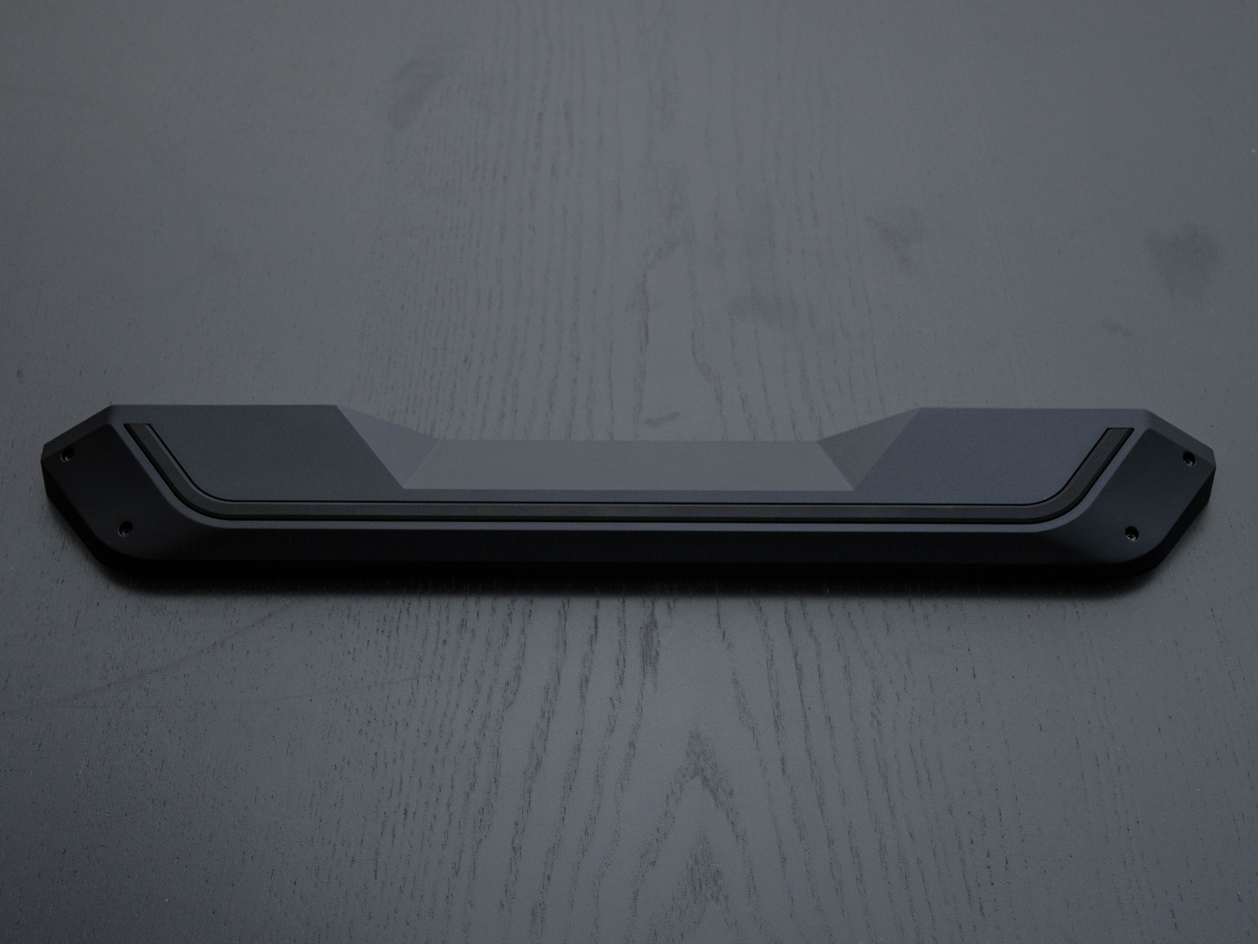 The edges adopt a design philosophy similar to the top cover and the area around the input devices, but they do so a bit more aggressively. The side edges are two tiered, with the top half containing the tweeters and exhaust ports, while the bottom half contains the I/O ports, larger exhaust vents, and is an extension of the bottom panel. The front edge also has two layers, with the mid-range speakers sitting at the side. You can connect the hand-rest here via magnets hidden inside both the rest and the front lip. The massive rear lip houses the rear exhaust vents, which feature criss-crossed grilles and stylized warning signs for the heat. In the middle is a valley holding additional I/O ports. A silver border wraps around the exhaust vents and rear I/O.