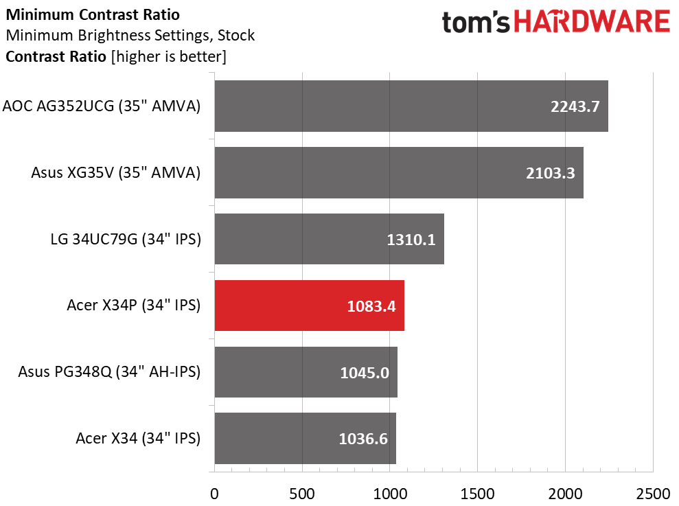 With ULMB left off the feature list, the Predator X34P doesn’t need a ton of output to accomplish its mission. It’s rated for 300 nits and measures comfortably over that at 319.8455cd/m2. It’s the brightest of the IPS monitors here, and that results in the highest black level: .2916cd/m2. Resulting contrast tops 1000:1 and is visually identical to the two-year-old X34 and the Asus PG348Q. LG manages to coax a little more dynamic range from its 34UC79G with a 1304.6:1 score.