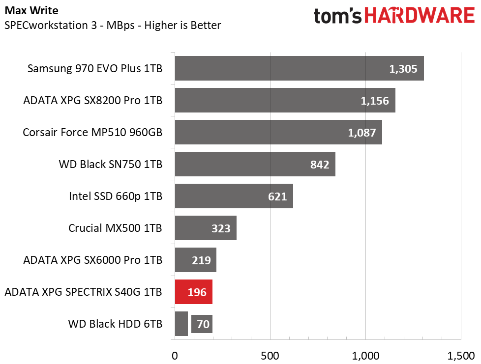 The S40G falls behind the crowd of mainstream competitors under SPECworkstation's heavy load. It ranks in fifth place and completed the benchmark in a similar time as an entry-level SSD. While it didn’t deliver high-end performance here, it still provides significantly better performance than the WD Black HDD.