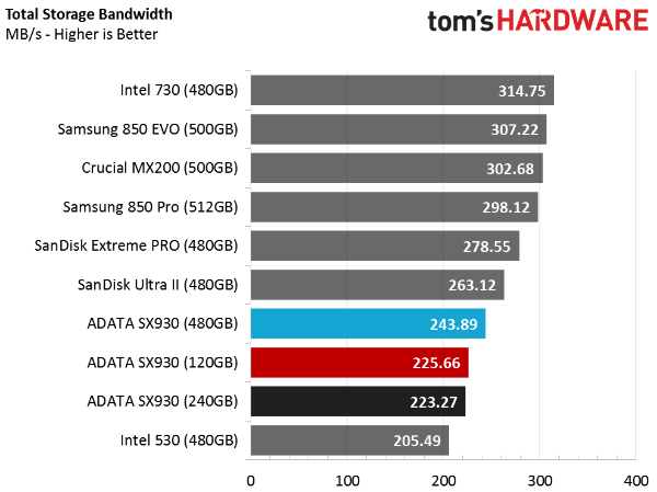 Now we'll average the results and look at performance in terms of throughput, rather than time. We're really checking to see whether Adata's SX930 can compete with Samsung's 850 EVO.