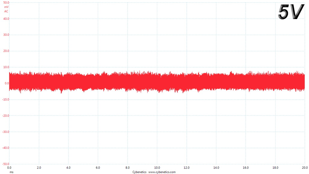 The following oscilloscope screenshots illustrate the AC ripple and noise registered on the main rails (+12V, 5V, 3.3V and 5VSB). The bigger the fluctuations on the screen, the bigger the ripple/noise. We set 0.01 V/Div (each vertical division/box equals 0.01V) as the standard for all measurements.