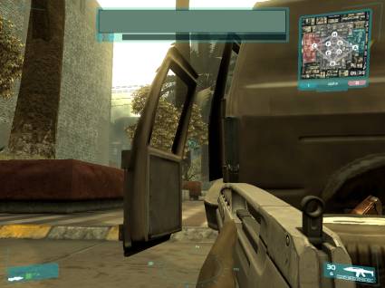 Although objects such as tires and doors can be moved into each other by firing on them with weapons, the player can't manipulate them directly. Without dedicated physics hardware, the player's avatar simply moves through them as if they weren't there.