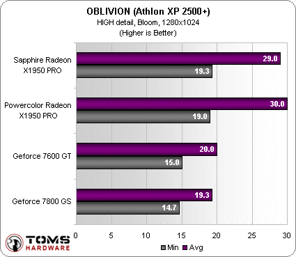 Much slower, the Oblivion engine likes to gobble up CPU power as well as GPU power. Now let's have a look at what happens when we increase resolution to 1280x1024 on the Athlon64 3400+: