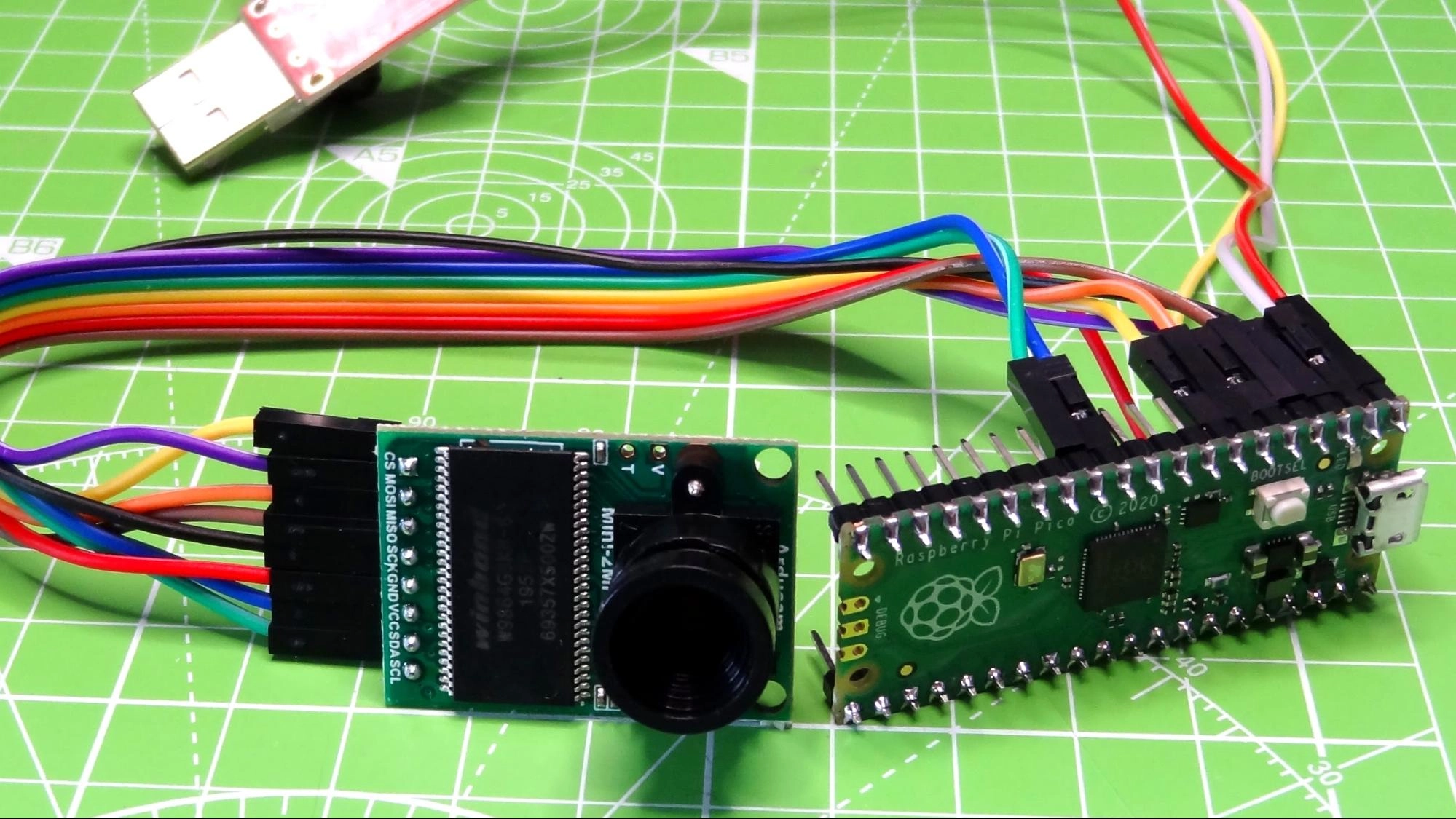 Connecting the camera to the Raspberry Pi Pico, or other RP2040 is a piece of cake thanks to the included jumper wires. The online resources clearly show the GPIO pins that we should use to connect the camera to the Pico and show the GPIO pins for the included CP2102 USB to TTL adaptor which is used to send video data from the Pico to an application, which in our review was a person detection script running Processing, a programming interface similar to the Arduino IDE but geared towards the visual arts.