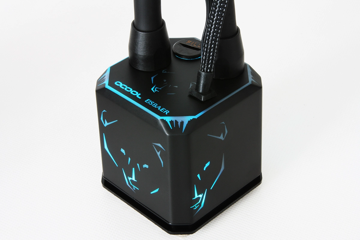 A rectangular portal that’s accented with RGB lights provides a view of the DC-LT pump’s inner workings, with a direct line of sight to its impeller. The remainder of the Eisbaer Aurora 240’s CPU block is matte black over an opaque graphic of the Alphacool Eisbaer logo under a ring of simulated icicles. RGB lighting from inside the cooling block shines through the graphic, providing subtle lighting to illuminate surrounding components.
