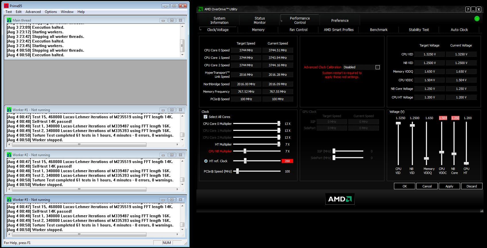 Notice that, because this is a locked processor, the CPU VID slider is already maxed out at 1.3250V. To raise the CPU voltage, the CPU VDDC slider is used to apply the offset voltage. In addition to 1.504V CPU VDDC, the NB VID and NB Core were bumped to 1.25V. This allowed the HT reference clock to be raised incrementally to 288 MHz without any further issues.