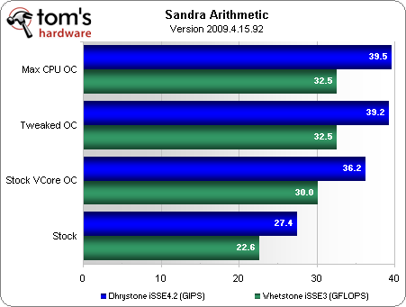 In the Sandra CPU Arithmetic test, the scores increase according to core speed, but our Tweaked OC shows no gains resulting from the overclocked northbridge.
