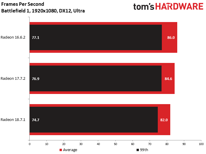 First, tab over to frame time chart. The two oldest driver versions—16.6.2 and 17.7.2—demonstrate big frame time spikes at similar points through our test sequence. AMD cards are especially notorious for stuttering when we start recording performance. This behavior largely ceases in 18.7.1. In fact, a lot of the frame time spikes shared between prior drivers disappear entirely with the latest one. The outcome is clear in our FPS by percentile breakdown: Adrenalin Edition 18.7.1 yields a smoother experience in the slowest 1% of frames, despite registering a lower average frame rate.