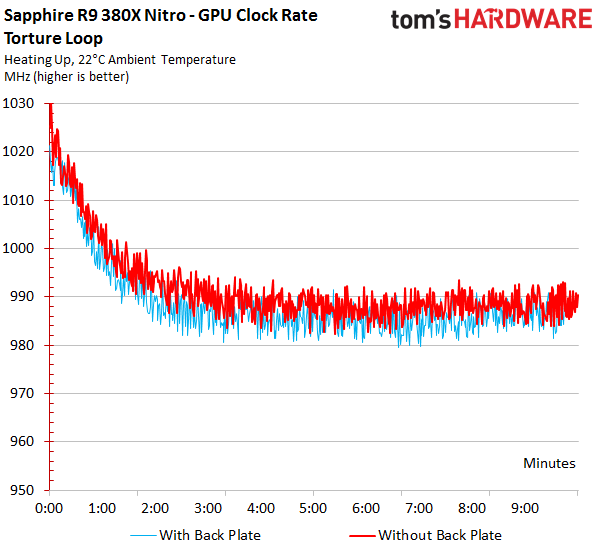 We wondered if the backplate might influence the 380X’s overall performance as we performed our infrared temperature measurements. Based on the GPU clock rate during the gaming loop, AMD's Radeon R9 380X doesn’t throttle quite as much with the backplate in place, even after the card reaches its maximum temperature. The periods of throttling we do observe can be replicated and occur at almost exactly the same times during our taxing load. Subjectively, only the most pronounced dips can be perceived as stuttering during gameplay.