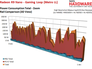 But let’s go back to gaming. We’re puzzled by the bars’ evenness. It’s not a secret that Nvidia’s GPU Boost is restrictive when it comes to hitting power targets. Up until now, AMD seemed fairly contrarian. But these results make it look like AMD is putting its foot down as well. You no longer see bursts of power consumption in certain scenes.