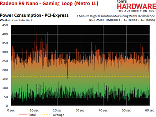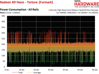 Here's where the story gets more interesting. AMD states a typical power consumption of 175W. With a cold card, we actually hit this number, which is great if you’re living in northern Alaska and love to keep your windows open. For everybody else, AMD's specifications prove elusive as soon as a full load, 4K resolution and a warm card come into play. The additional 8W of leakage current doesn't sour us on the Nano's power result, though.