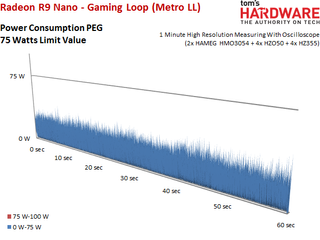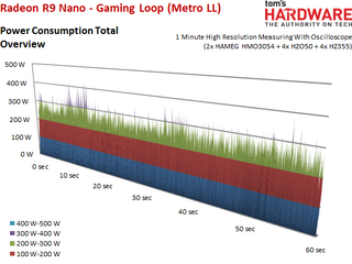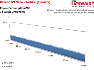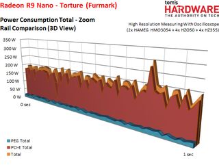 The Radeon R9 Nano’s power consumption is actually slightly lower during the stress test than some of our gaming benchmarks due to a constant load that pushes clock rates down quite a bit.