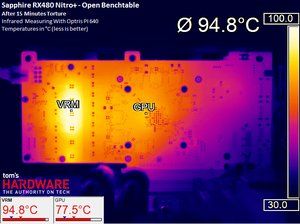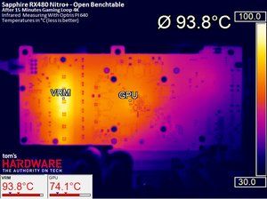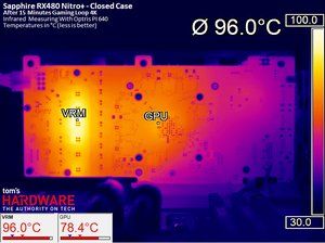 Registering about 201°F (94°C) during our gaming loop on an open test bench, and 205°F (96°C) inside a closed case, this card is at the limit of what could be considered healthy. Sure, the MOSFETs can operate at up to 150°C without any damage. But over time, the PCB material can suffer irreversible damage, causing hairline cracks in the traces of multi-layer boards. At least the GPU and memory temperatures are still fairly safe.