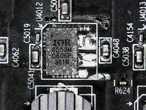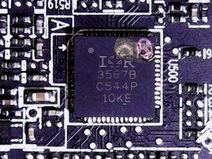 The GPU is fed by five power phases using International Rectifier's IR3567B dual-output 6+2-phase controller (yes, this component could have allowed Sapphire to use six phases). Voltages are generated by one highly integrated IR3555 per phase, which combines the gate driver, high- and low-side MOSFETs, and Schottky diode in one package.