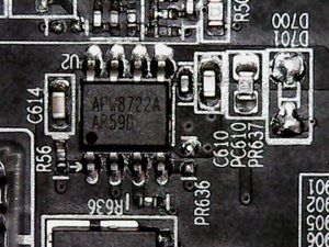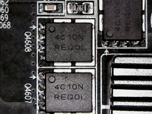 In contrast, the memory's voltage regulation circuitry consists of just one phase. An Anpec APW8722 synchronous buck converter controls three ON Semiconductor NTMFS4C10N single N-channel MOSFETs (one is responsible for the high side and two take care of the low side).