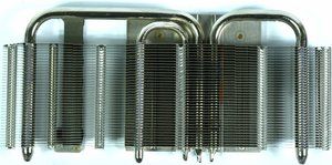 A copper sink over the GPU is mounted into the cooling frame. Turned over, this large mass is topped with one short 6mm heat pipe and two 8mm pipes. They aren't pressed into the sink, though.