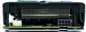 Around back, we catch a glimpse of the heat sink's fins behind an eight-pin power connector, while underneath we see two 8mm heat pipes and a smaller 6mm pipe.